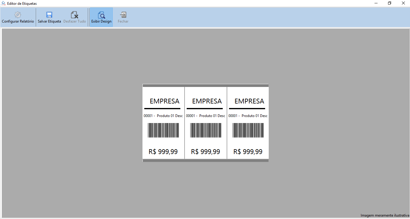 Nesta tela ainda são exibidas as opções Configurar Relatório, que retornará para a tela de edição do LazReport, Salvar Etiqueta, Desfazer Tudo, Exibir Preview e Fechar. Ao selecionar a opção Exibir Preview será exibida a etiqueta como será impressa, no exemplo da imagem 21 foram configuradas 3 colunas de impressão.