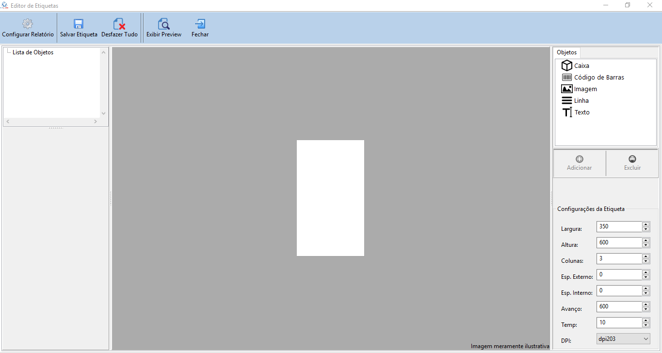 O editor de etiquetas é uma ferramenta criada pela DJSystem que visa facilitar a criação e edição do leiaute. Nesta tela, conforme imagem 19, pode-se determinar as configurações da etiqueta, inserir e editar objetos, estão disponíveis os objetos Caixa, Código de Barras, Imagem, Linha e Texto, inicialmente ela é apresentada em branco e é preciso inserir os objetos que deseja utilizar.