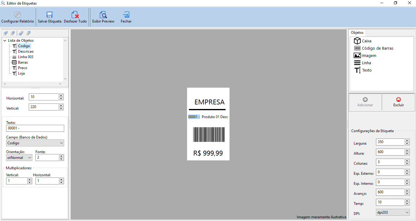 Ao selecionar o objeto na etiqueta serão exibidas as opções de campos a serem editados do lado esquerdo, abaixo da Lista de Objetos. Acima da Lista de Objetos são exibidos 4 botões que possuem a função de alterar a ordem dos objetos contidos na lista, caso a Caixa seja inclusa após a inserção dos outros, ao tentar clicar nos objetos no leiaute da etiqueta não será possível selecioná-los, para que consiga novamente, será preciso alterar a ordem da Caixa, deixando-a como o primeiro objeto da lista.